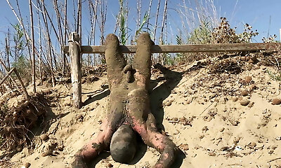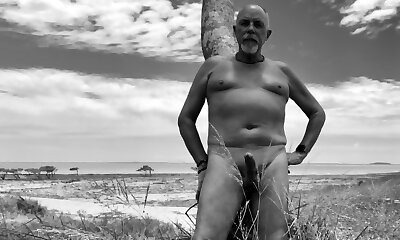 Playing outside at the beach naked and erect