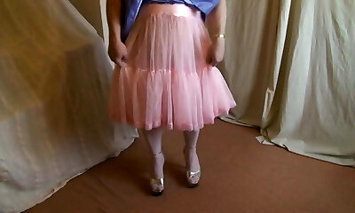 Lilac bridesmaid dress, pink petticoat and platform heels